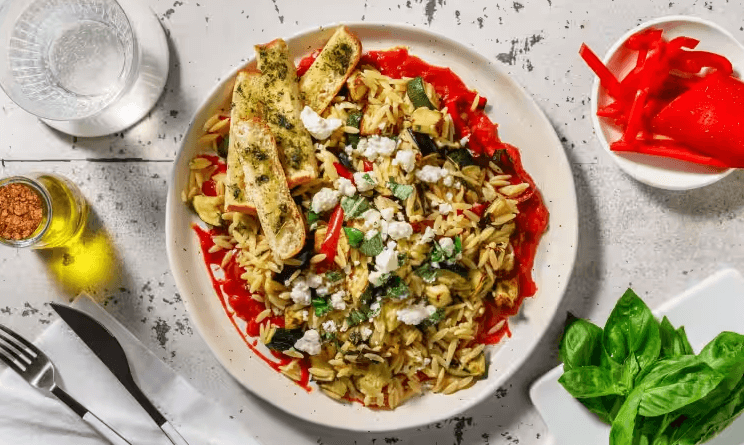 - Orzo met geroosterde ratatouille en volkoren knoflookbrood met gerookte paprika, witte kaas en vers basilicum.