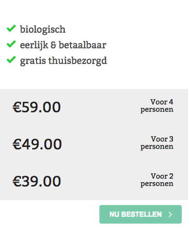 Claudia woont alleen en zocht een maaltijdbox voor 1 persoon. Ze kwam uit bij de biobox voor 1 persoon. De kosten hiervan zijn normaal gesproken €39 per bestelling. Om deze kleine foodbox nu goedkoop uit te proberen kun je gebruik maken van de december actie en hem tijdelijk bestellen voor €29. Zo kunnen ook kleine huishoudens biologisch eten. Het wordt ook nog eens gratis thuisbezorgd!