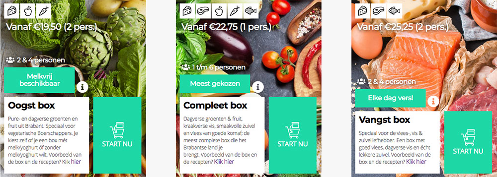 1. Als eerste kies je uit een van de boxen zoals hierboven omschreven. Met behulp van de icoontjes vind je snel een box die past bij jouw wensen. Je kunt vooraf voorbeelden van recepten bekijken.