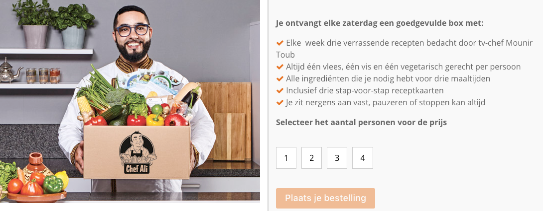 Het bestellen van de Chef Ali maaltijdbox is erg eenvoudig. Op de website Chefali.nl hoef je namelijk niet te kiezen uit verschillende boxen of recepten. Er is wekelijks 1 box, en de inhoud staat van tevoren al vast. Je kunt deze box bestellen voor 1, 2, 3 of 4 personen. Daarbij kun je kiezen tussen een eenmalige proefbox of voor het flexibele abonnement.