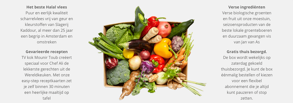 - Chef Ali is de enige box met uitsluitend Halal vlees. Het gaat hier om puur scharrelvlees vrij van geur en kleurstoffen. Het vlees is afkomstig van Slagerij Kaddour, een slagerij met een erg goede reputatie in de omgeving van Amsterdam.