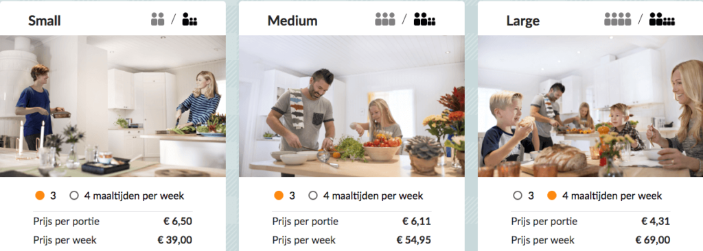 Over het aanbod zijn we bij De Familiebox redelijk enthousiast. Je kunt namelijk zelf wekelijks kiezen uit 12 recepten. De box kan je dus helemaal samenstellen naar eigen wens en smaakvoorkeuren Vind je een bepaalde maaltijd niet lekker, dan kies je deze gewoon niet. Het voordeel is dat je op deze manier wel meer nieuwe dingen leert eten. Je stapt echt buiten je comfort-zone. Dit kan vooral ook voor kinderen goed zijn. Op dit moment kun je kiezen uit 3 verschillende boxen: een Small (2-3 personen), Medium (3-4 personen) en Large (4-5 personen). Alle boxen kun je bestellen met 2, 3 of 4 maaltijden. Kies je meer gerechten? Dan gaat de prijs per persoon per maaltijd al snel omlaag.
