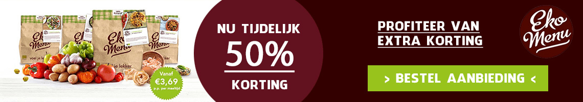 Ekomenu is een heel populaire biologische maaltijdbox die gezond en lekker eten makkelijk maakt. De box is 100% personaliseerbaar. Je kunt kiezen uit 15 leefstijlen, elke week staan er 25 nieuwe gerechten voor je klaar. De box bevat lekker veel verse groenten, altijd dagvers van de lokale boer en zoveel mogelijk van het seizoen. In de box vind je geen kunstmatige toevoegingen, E-nummers of andere bestrijdingsmiddelen. Dacht je dat biologisch eten duur is? Ekomenu bewijst het tegendeel: Voor ‘t zelfde geld 100% biologisch