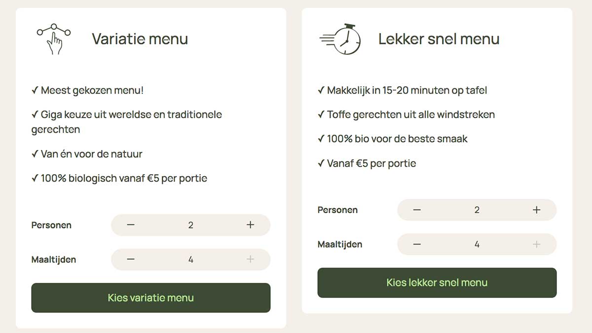 Op deze pagina vind je alle informatie over deze maaltijdbox. Je leest hier meer over de verschillende menu’s en info over het abonnement. Daarnaast kan je hier terecht voor reviews van andere gebruikers. Vergeet ook niet jouw eigen ervaringen met deze biologische maaltijdbox te delen. Via de persoonlijke ekomenu bestelmodule kun je kiezen uit 15 verschillende levensstijlen. Dit zijn een soort boxen afgestemd op je persoonlijke behoeftes en allergieën. Hieronder kun je enkele van deze levensstijlen bekijken.