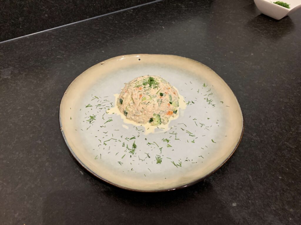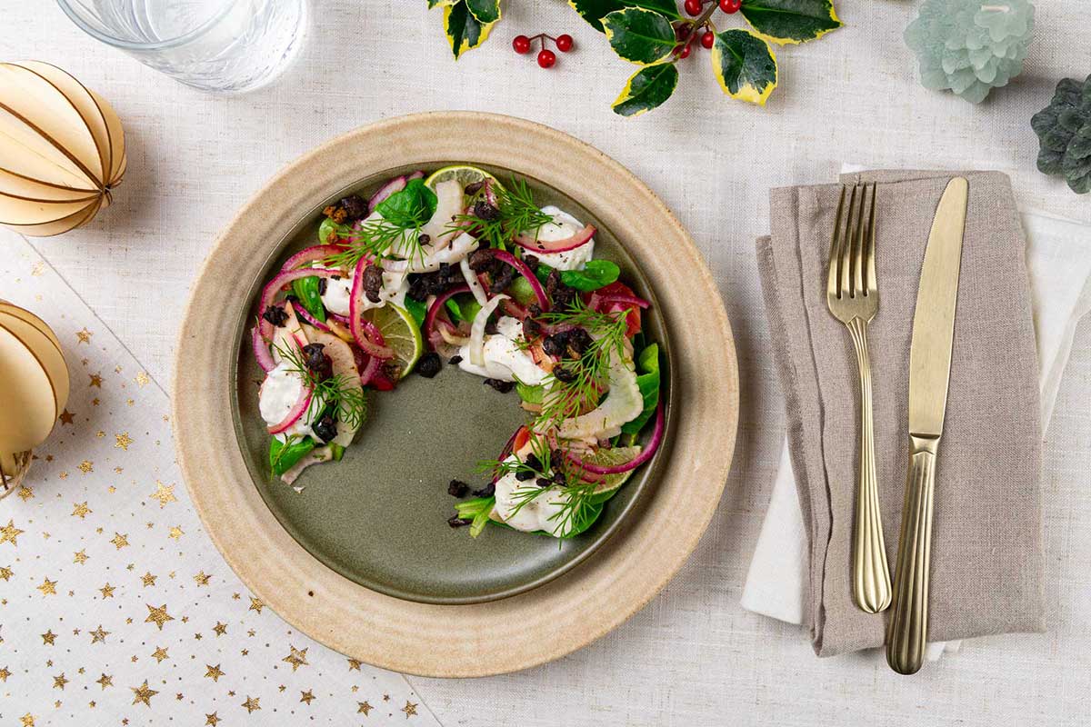 3. Hoofdgerecht: Venkel-bloedsinaasappelsalade met gerookte zalm, roomkaasdip, wasabi en macadamia