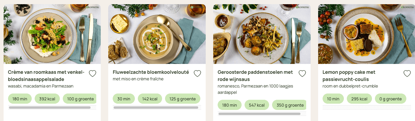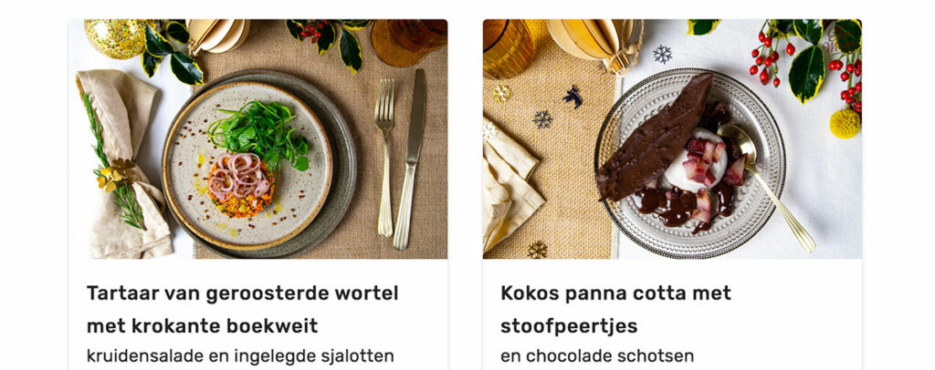 Je kunt kiezen uit 2 kerstboxen: een klassiek diner met vlees en vis en een vegetarisch diner (deze kan je eenvoudig omtoveren tot een vegan-menu). Het kerstdiner van Ekomenu sluit helemaal aan op hun missie: gezonder en eerlijker eten. Alle ingrediënten zijn biologisch lekker, van lokale makers en boeren, en dat proef je! Je ontvangt alle ingrediënten en een superhandig stappenplan voor een ontspannen kerst. Om je een idee te geven wat je kunt verwachten hebben we hieronder de 4 gangen menu’s voor je op een rijtje gezet: