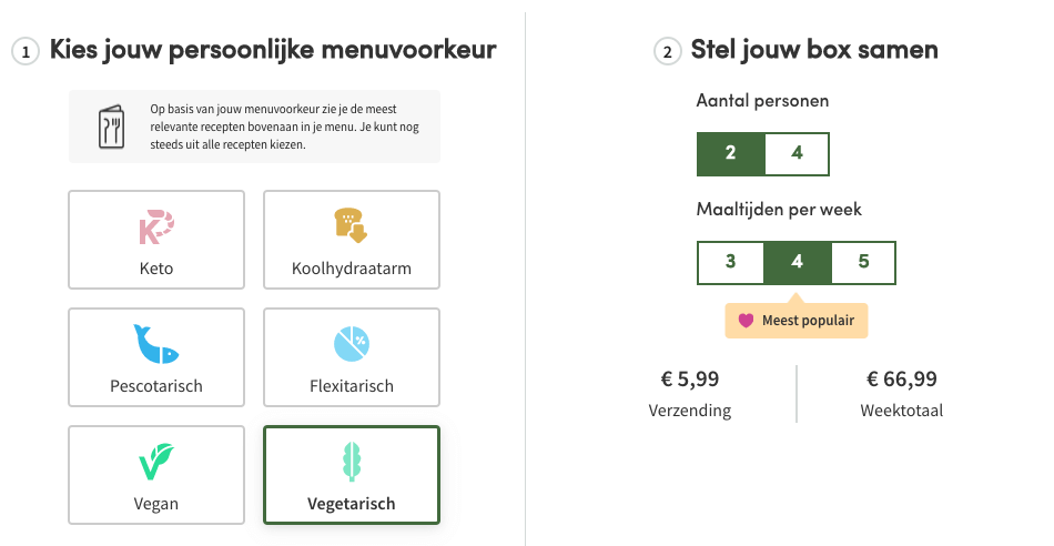 - Kies het aantal gerechten dat je wekelijks wilt ontvangen (3, 4 of 5) en uit hoeveel mensen je gezin bestaat (box voor 2 personen of 4 personen).
