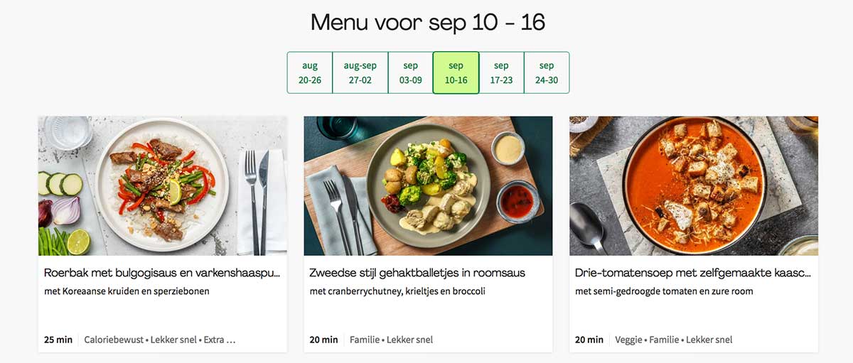 Wekelijks kan je dus kiezen uit meer dan 30 verschillende recepten. Groot voordeel: er is heel veel variëteit in de gerechten. Van stamppot tot visgerechten, en van een broodje hamburger tot een luxe ovenschotel: Er zit voor iedereen wel wat lekkers tussen. Je kunt gemakkelijk filteren op bijvoorbeeld “veggie”, “lekker snel”, “familie”, of “caloriebewust” om de juiste recepten te vinden. Eet je graag vegetarisch? Elke week zijn er ongeveer 15 gerechten zonder vlees en vis. Ook voor mensen die snel willen koken of willen letten op de calorie inname is er meer dan voldoende keuze.