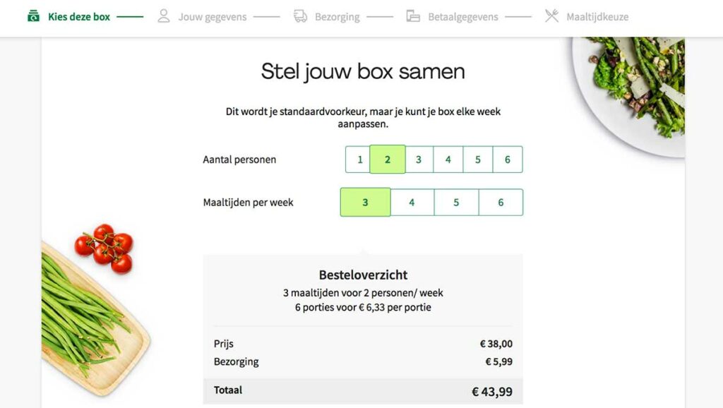 Bestel je voor het eerst bij HelloFresh? Dan moet je allereerst een box samenstellen. Je kiest hier het aantal personen en het aantal maaltijden per week. Eventueel kan je ook een maaltijdvoorkeur opgeven. Bijvoorbeeld Veggie, Familie of Lekker Snel. Dit is niet verplicht, en je zit ook niet vast aan deze voorkeuren. Het is alleen een hulpmiddel om sneller gerechten te kiezen die passen bij jouw wensen en leefstijl. Je kunt uiteindelijk altijd uit alle 30+ recepten kiezen. Je ziet nu direct de totaalprijs van jouw box. In de volgende stap moet je jouw gegevens invullen, een bezorgadres opgeven, een bezorgmoment kiezen en een betaalmethode kiezen. Als dat gelukt is kan je de recepten voor jouw eerste box kiezen.