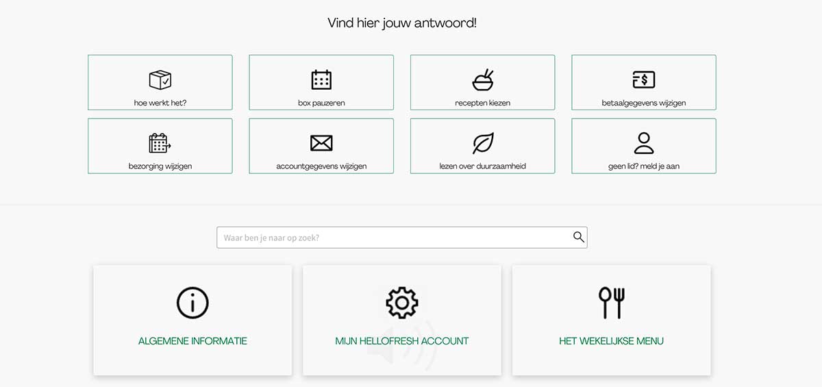HelloFresh heeft een attente en snelle klantenservice. Op de website vind je een uitgebreide kennisbank waar je antwoorden kunt vinden op veelgestelde vragen. Alles over je lidmaatschap, bezorgingen, betalingen en recepten kun je hier eigenlijk wel terugvinden. Heb je een andere vraag? Dan kun je op een aantal verschillende manieren contact opnemen met HelloFresh: