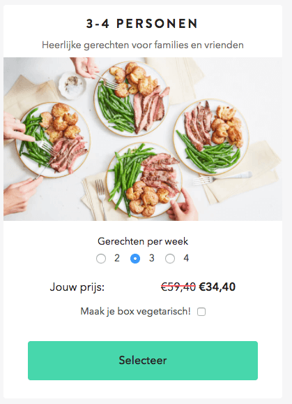 • De eerste box met 2 gerechten voor 3 personen bestel je vanaf €21,25 (inclusief bezorging)
