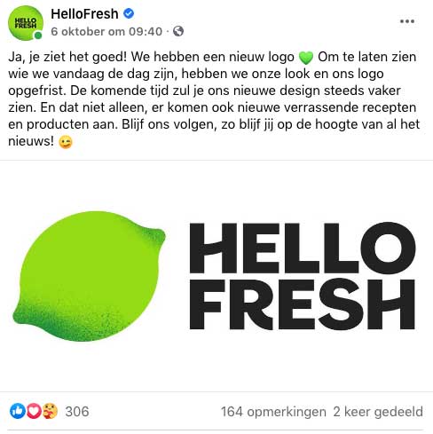 HelloFresh heeft een nieuwe logo. Het nieuwe logo vinden we inmiddels terug op de website, sociale kanalen en op de verpakkingsmaterialen van HelloFresh. Het nieuwe logo is een stuk strakker dan het vorige logo. In het nieuwe logo vinden we nog steeds het groene limoentje. Het verschil is dat de letters nu niet meer in de groene limoen staan, maar er naast. Daarnaast heeft HelloFresh gekozen voor een wat strakker lettertype. Op social media zien we dat sommige klanten nog wat moeten wennen aan het nieuwe logo.