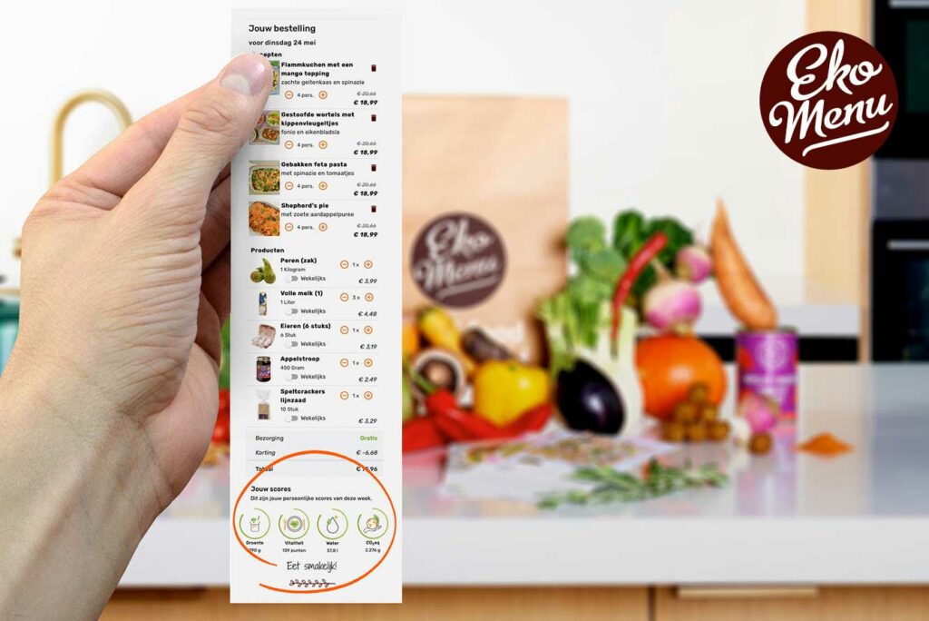Met een maaltijdbox eet je gezond en divers. Dat was je misschien wel duidelijk. Maar Ekomenu probeert nog een stapje verder te gaan. Elke week ontvang je nu een digitale kassabon met daarop precies de scores hoe gezond en bewust je die week gegeten hebt. Dit noemen zij jouw Foodprint. De Foodprint bestaat uit 4 factoren: groenten, vitaliteit, CO2-uitstoot en waterverbruik. Per week zie je precies wat jouw scores zijn en welke invloed jouw keuzes hebben op jouw eigen gezondheid en op het klimaat.