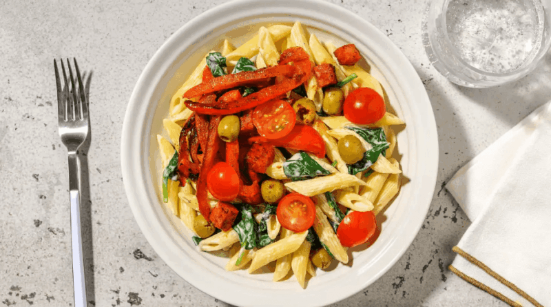• Romige pasta met chorizo en olijven, cherrytomaten, puntpaprika en spinazie.