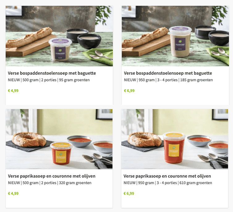 Op dit moment staat er wekelijks 1 smaak soep klaar. Dit kunnen bijvoorbeeld zijn tomatensoep, groentesoep, uiensoep, mosterdsoep of bospaddenstoelensoep. Per week kun je kiezen voor een portie voor 2 personen of een verpakking voor 3-4 personen. Bij de soep wordt ook een stokbrood meegeleverd. Zo kun je er dus een complete maaltijd van maken (of een lekkere lunch). De soepen zijn binnen enkele minuten op te warmen omdat ze reeds bereidt geleverd worden. Een snelle maaltijd dus, voor het hele gezin. Lekker en gezond (zonder suiker en weinig zout).
