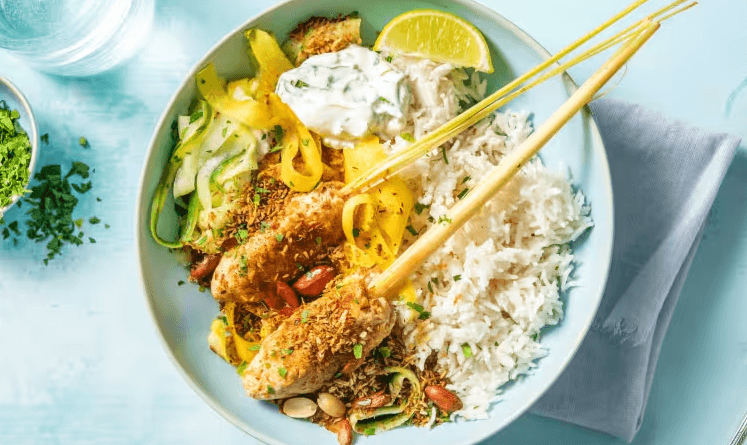 - Kipspiezen met geurige kokosrijst, satéstokjes van citroengras en zelfgemaakte seroendeng.