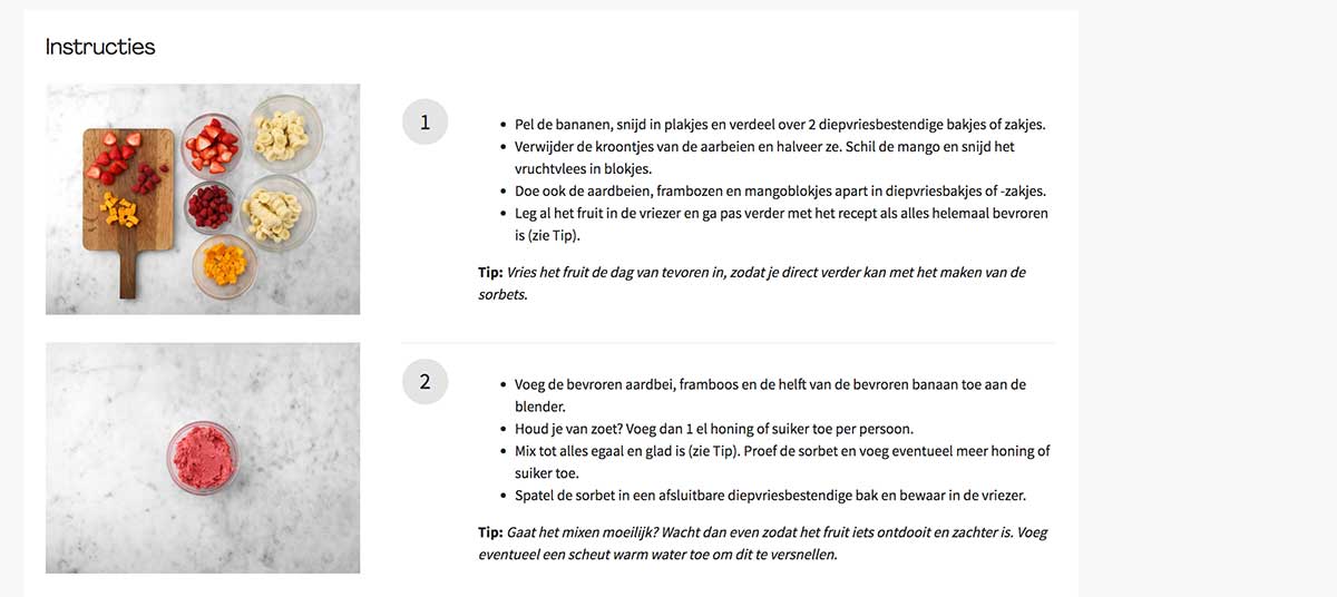 Wil jij nu zelf snel en simpel een lekker sorbetijsje maken? Dan hebben we eigenlijk 2 tips. De eerste tip: heb jij een maaltijdbox van HelloFresh? Kies dan in de Markt het zelfgemaakt sorbetijs met 2 zomerse smaken. Hiervoor betaal je slechts €14,99 en het is genoeg voor 4 porties. Leuk om te maken (zeker met kids) en een perfect dessert op een warme dag! In de HelloFresh App vind je alle informatie. Hieronder delen we alvast de stappen die je moet doorlopen.: